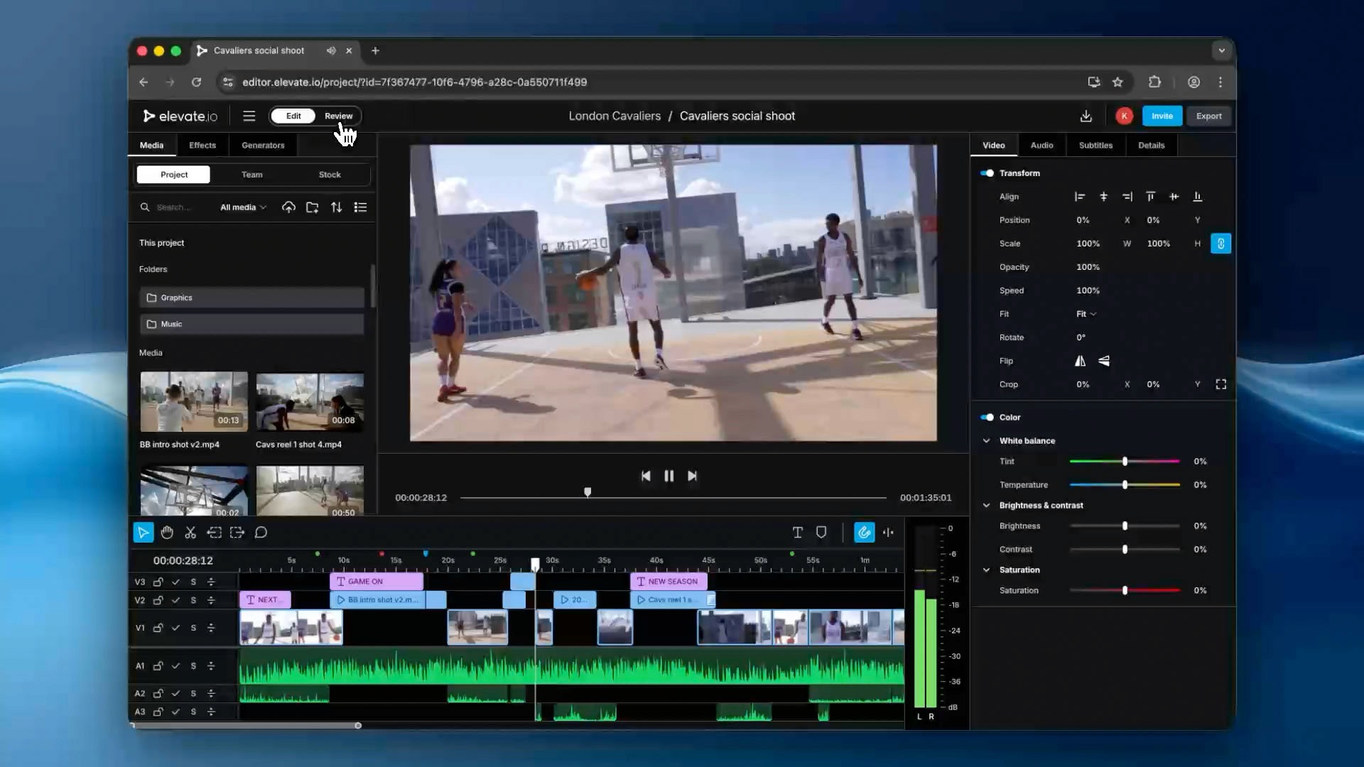 Because elevate.io is a fully online video editor and Review mode is integrated seamlessly into the platform, your team edits and reviews on the same cloud-based timeline. You can iterate collaboratively without ever exporting, meaning you'll free up all the time traditionally wasted on rendering and uploading countless versions for each round of feedback. With elevate.io, you export only once — when the project is perfected and fully signed off.